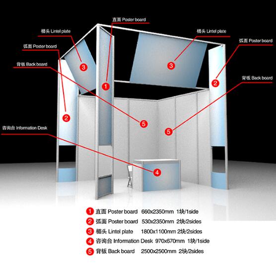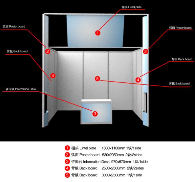 • 中(英)文楣牌(2块) • 两面白色壁板• 咨询桌一张 • 折椅二张• 地毯满铺 • 展位照明• 220V/1电源插座一个 • 废纸篓一个